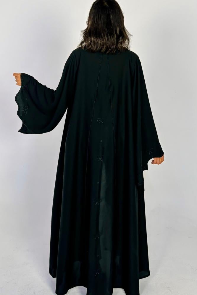 صممت هذه العباية بتطريز فيونكه و إطار متعرج باللون الأسود المميز بطرف الكم وأطراف العباية من الأمام، وايضا أطراف الكسرة يوجد تطريز اسود للفيونكه ومن الخلف تأتي بكسرة داخلية كبيرة.