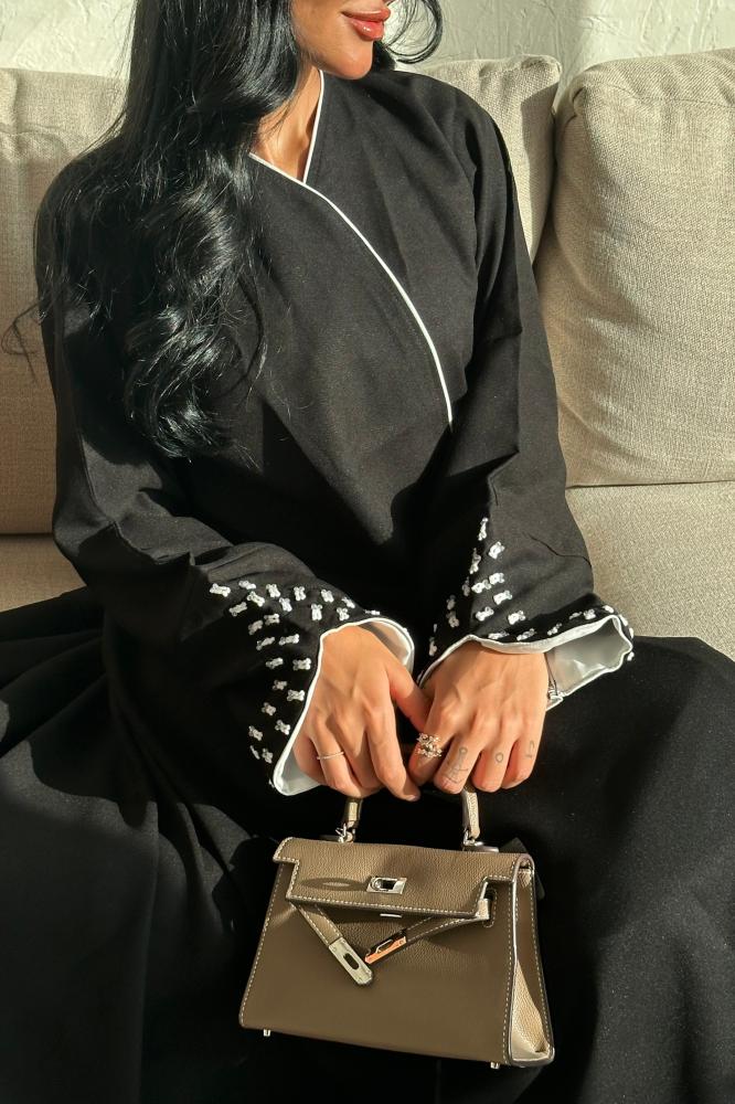 تأتي أنيقه بتفاصيلها تتميز بتصميم عملي وأنيق تأتي العبايه السوداء بتحديد ابيض من الأمام و الأكمام ليضيف ستايل جاذب